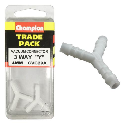 CVC29A | Champion Hose Fitting-Equal "Y" Piece-4mm - 2pk Specifications • Thermoplastic Polymer, heat and chemical/fuel resistant • 4mm • Pack Size: 2