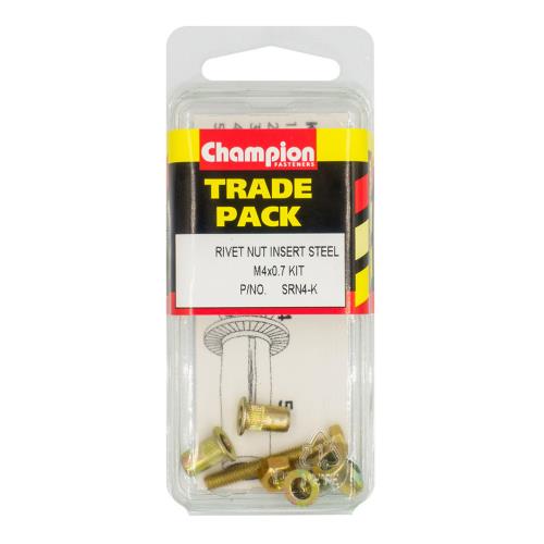 SRN4-K | Champion Rivet Nut Insert Steel Kit M4 x 0.7mm - 4pk Specification • M4 x 0.7mm • Steel • Reusable nut and bolt • Pack Size: 4