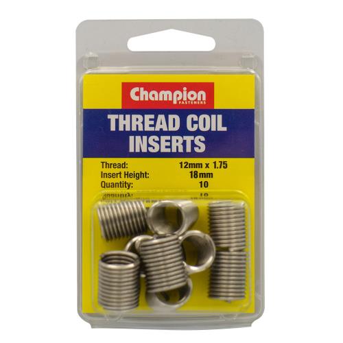 CTRM1217518 | Champion Thread Insert Refills – M12 x 1.75 x 18mm Specifications • Insert Size: 12mm x 1.75mm x 18mm • 304 stainless steel • Pack Size: 10