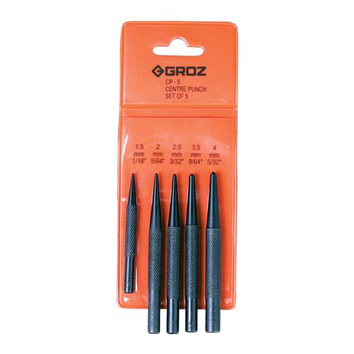 A set of 5 centre punches packed in a vinyl pouch. Single piece construction with round shank and round striking head.