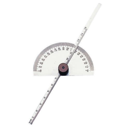 • Manufactured from stainless steel, the protractor head has permanent deep etched graduations, 0°-180° in opposite directions, thus permitting reading an angle directly and also its supplement.